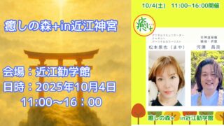 マルシェ 10月4日 癒しの森+in近江神宮 🌳 癒しの森+ in 近江勧学館 時間:2025年10月4日(土) 11:00〜16:00 会場:近江勧学館(近江神宮境内) 住所:〒520-0015 滋賀県大津市神宮町1-1 主催:癒しの森マルシェ イベント内容 呼吸と祈りを軸に、内なる... 2025.09.19 マルシェ